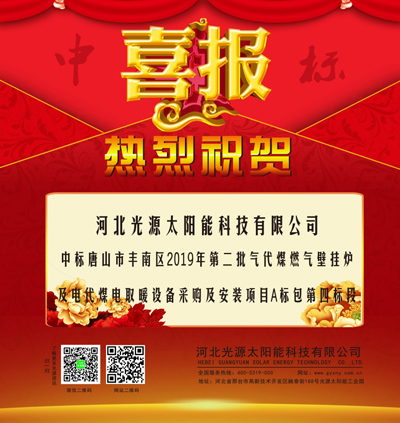 奮力拼搏創佳績,捷報頻傳奏凱歌。河北光源太陽能科技有限公司,在2019年09月27日,唐山市豐南區2019年第二批氣代煤燃氣壁掛爐及電代煤電取暖設備采購及安裝項目A標包第四標段中標,為我公司2019年度輝煌的經營業績再添濃墨重彩的一筆。