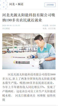 新華社報道說:“河北光源太陽能科技有限公司投資3000多萬元,新上了兩條全國領先的太陽能采暖水箱生產線,吸納190多名農民就近就業,今年上半年銷售收入同比增長77%,實現了產銷兩旺。”